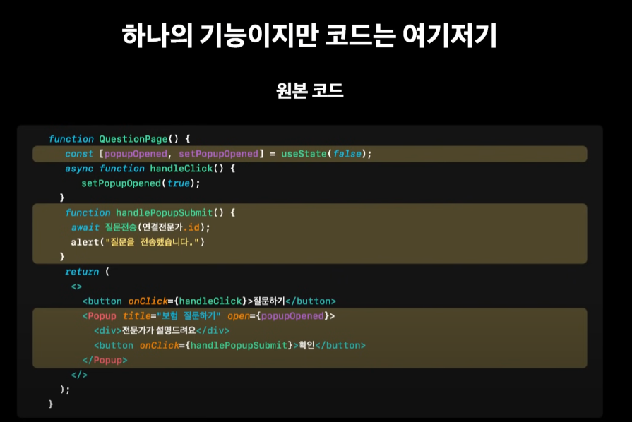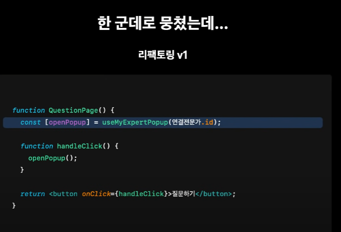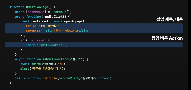 => 팝업에서 버튼을 눌렀을때 어떤 액션을 하는지가 중요한 부분이지만 hook속에 가려져 알 수 없다.