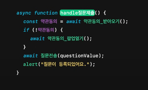 ❌ 함수 내용에는 "약관체크"와 "질문제출"이 섞여있다.