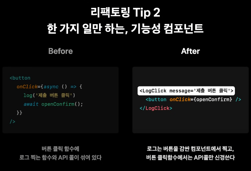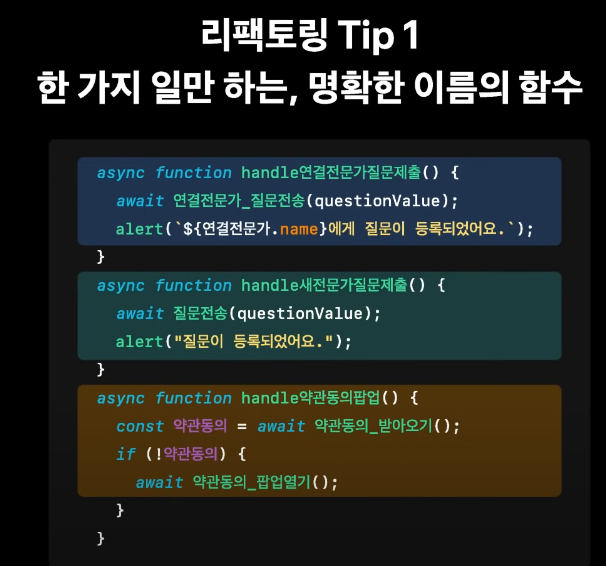 - 한가지 일만 하는 함수를 따로따로 작성 , 명확한 함수 이름 작성