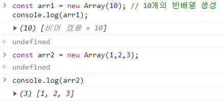 const arr1 = new Array(10); // 10๊ฐ์ ๋น๋ฐฐ์ด ์์ฑ