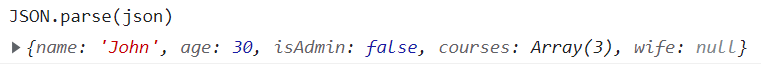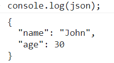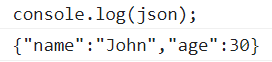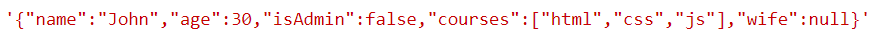 console.log(json); //'{"name":"John","age":30,"isAdmin":false,"courses":["html","css","js"],"wife":null}'